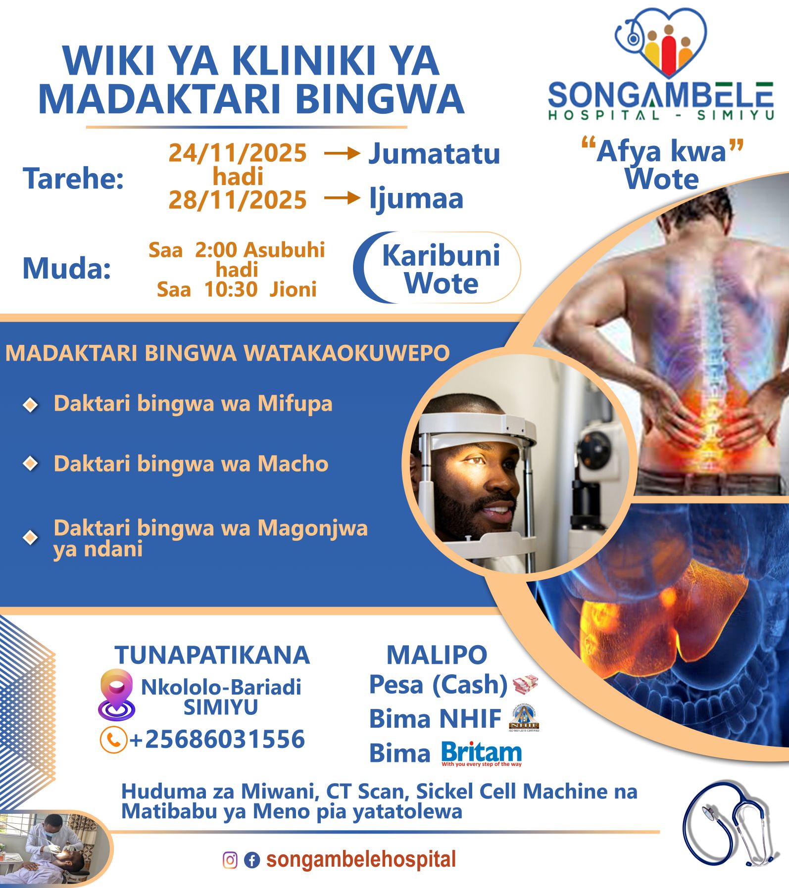 Wiki ya kliniki ya Madaktari bingwa wa Mifupa, Macho na Magonjwa ya ndani kuanzia tarehe 24/11/2025 hadi 28/11/2025 karibuni wote…